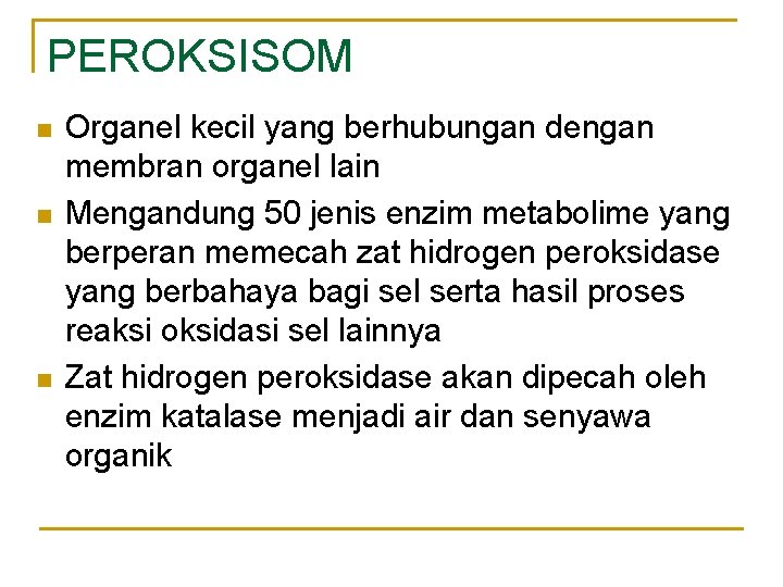 PEROKSISOM n n n Organel kecil yang berhubungan dengan membran organel lain Mengandung 50 jenis enzim metabolime yang berperan memecah zat hidrogen peroksidase yang berbahaya bagi sel serta hasil proses reaksi oksidasi sel lainnya Zat hidrogen peroksidase akan dipecah oleh enzim katalase menjadi air dan senyawa organik