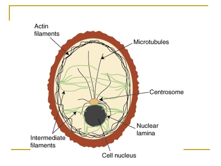 SITOSKELETON n n n Sitoskeleton : kumpulan protein yang berperan sebagai jaringan pengikat di dalam sel. (memberikan bentuk sel, pergerakan sel dan sebagai jaringan pengisi sitoplasma) Sitoskeleton terdiri dari filamen aktin, filamen intermediate dan mikrotubul. Filamen aktin : bekerja sama dengan sitosin untuk menggerakan sel-sel otot, mampu mengubah energi ATP menjadi energi gerak.