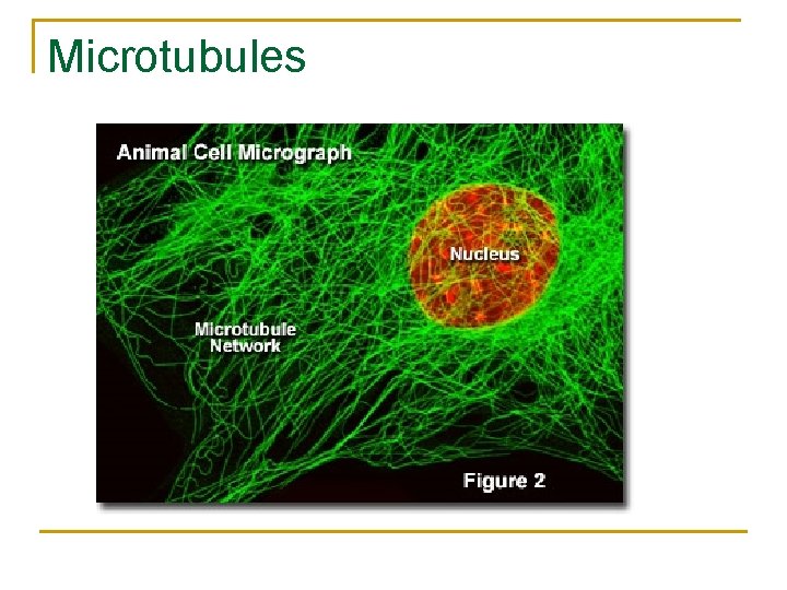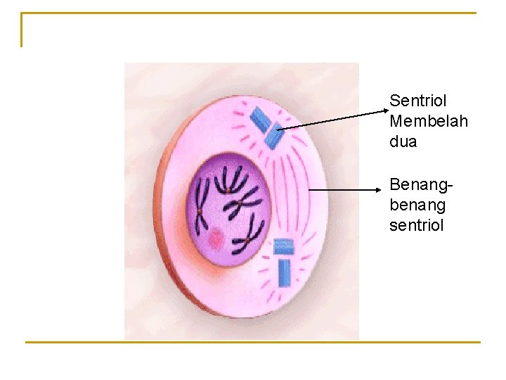 n n Mikrotubul mengandung protein tubulin membentuk sentrosom Sentrosom berperan dalam proses pembelahan sel Saat sel tidak membelah (fase interfase), sentrosom terletak di dekat inti sel Saat sel akan melakukan pembelahan, sentrosom membelah dua sentriol dan bergerak menuju kutub berlawanan yang akan kromosom oleh benang-benang sentriol