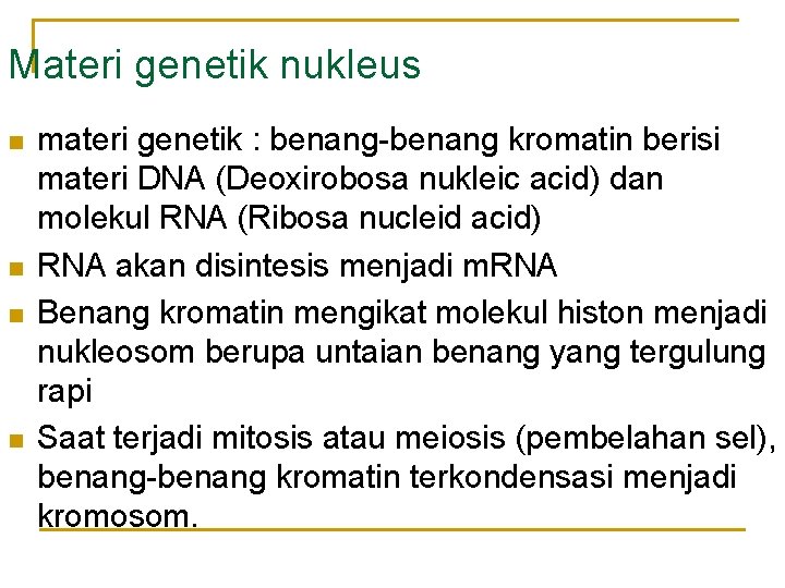 Materi genetik nukleus n n materi genetik : benang-benang kromatin berisi materi DNA (Deoxirobosa nukleic acid) dan molekul RNA (Ribosa nucleid acid) RNA akan disintesis menjadi m. RNA Benang kromatin mengikat molekul histon menjadi nukleosom berupa untaian benang yang tergulung rapi Saat terjadi mitosis atau meiosis (pembelahan sel), benang-benang kromatin terkondensasi menjadi kromosom.