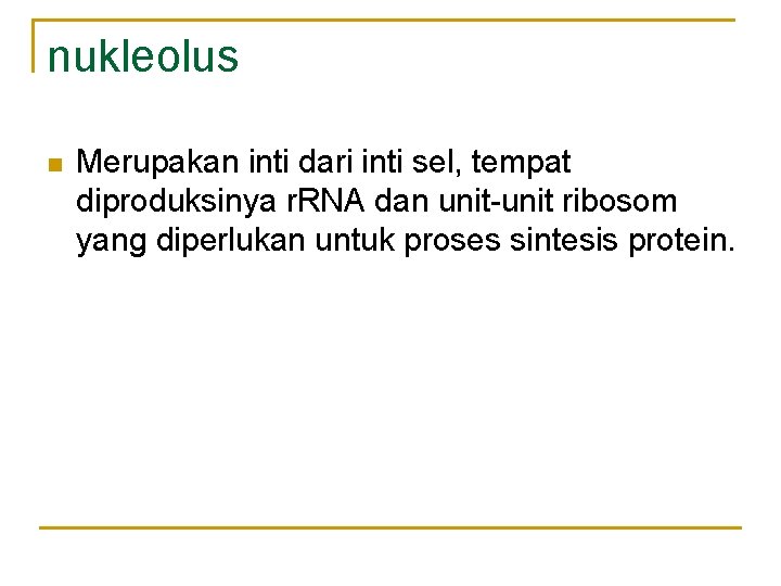 nukleolus n Merupakan inti dari inti sel, tempat diproduksinya r. RNA dan unit-unit ribosom yang diperlukan untuk proses sintesis protein.