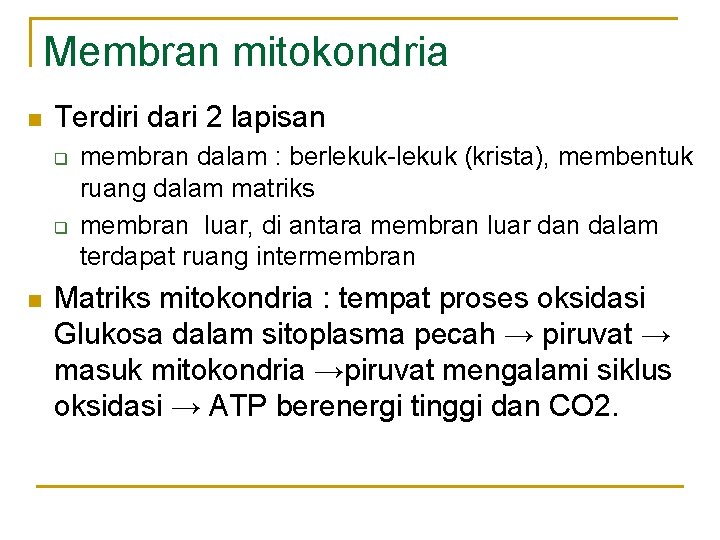 Membran mitokondria n Terdiri dari 2 lapisan q q n membran dalam : berlekuk-lekuk (krista), membentuk ruang dalam matriks membran luar, di antara membran luar dan dalam terdapat ruang intermembran Matriks mitokondria : tempat proses oksidasi Glukosa dalam sitoplasma pecah → piruvat → masuk mitokondria →piruvat mengalami siklus oksidasi → ATP berenergi tinggi dan CO 2.
