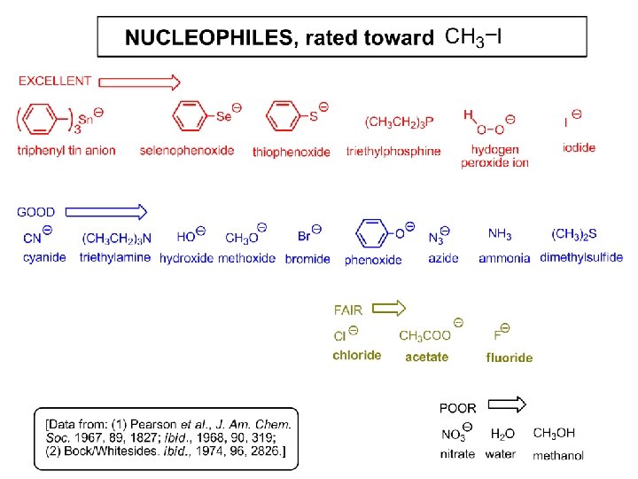 Q: Which elements are nucleophiles? A: Main Group, the C, N, O, and F–groups There are two general trends in Nu-strength: (1) The atomic number (down) and (2) the electronegativity (left) A t o m i c n u m b e r Electronegativity poor Nu very good Nu excelent Nu