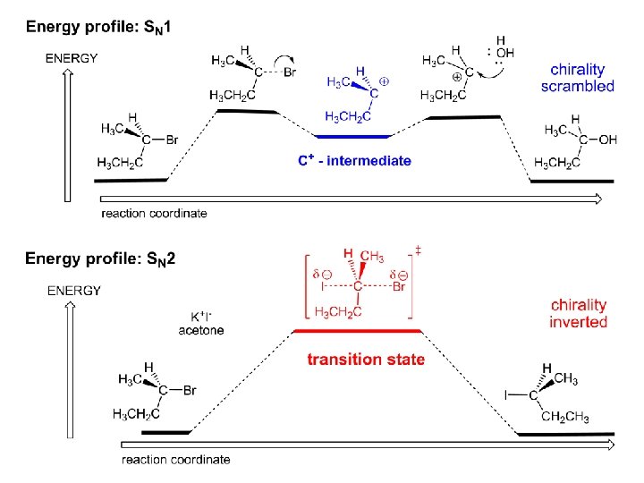 Summary of differences: SN 2 vs. SN 1 SN 2 SN 1 Substrate: 1 Cº, uncrowded 3º, C crowded Nucleophile: good: I-, Br-, CN-, R 3 N, N 3 - irrelevant good, low p. Ka of conjug acid Solvent: polar aprotic; DMSO, acetone OH, SH, NH type solvent Reaction flow: concerted, transition state stepwise, C+ intermediate Leaving group: