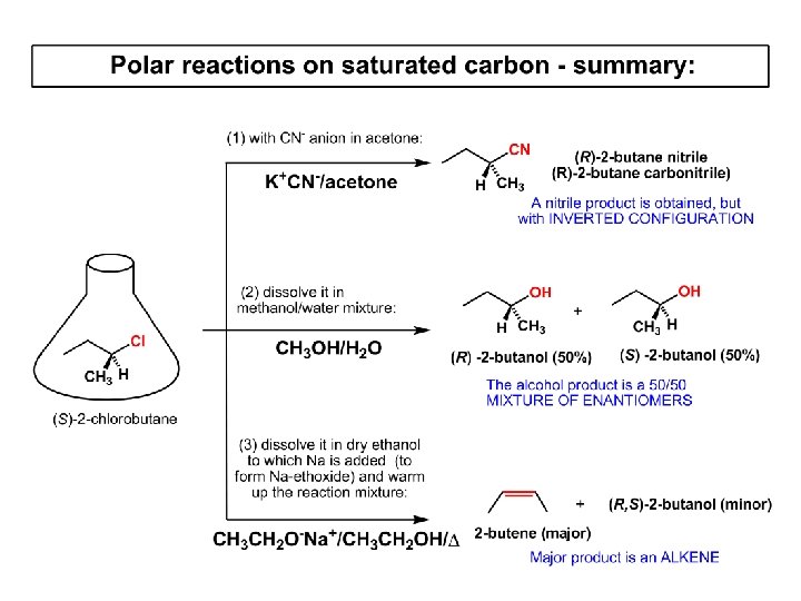 [6. 13] A new page – and a new chemistry: The same substrate but a different reaction Substitution, nucleophilic - but a different one: The reaction: (2 R)-bromobutane (2 S)-butanol (2 R)-butanol (Optically inactive racemic mixture)