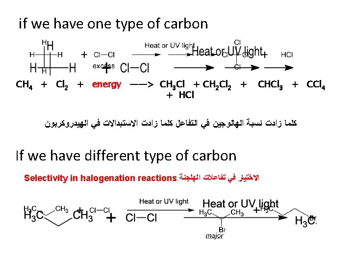 Reaction of alkanes 1 - Halogenation Free radical mechanism CH 4 + Cl 2 + energy —> CH 3 Cl + HCl