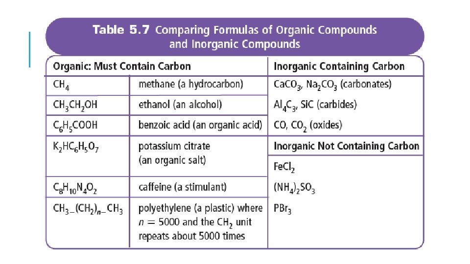 ORGANIC COMPOUNDS Organic compounds contains carbon and usually hydrogen “Organic” sounds like the compounds come from living things, but some do and some don’t. Inorganic compounds are compounds that do not have carbon (as well as some exceptions: CO 2, CO, and ionic carbonates