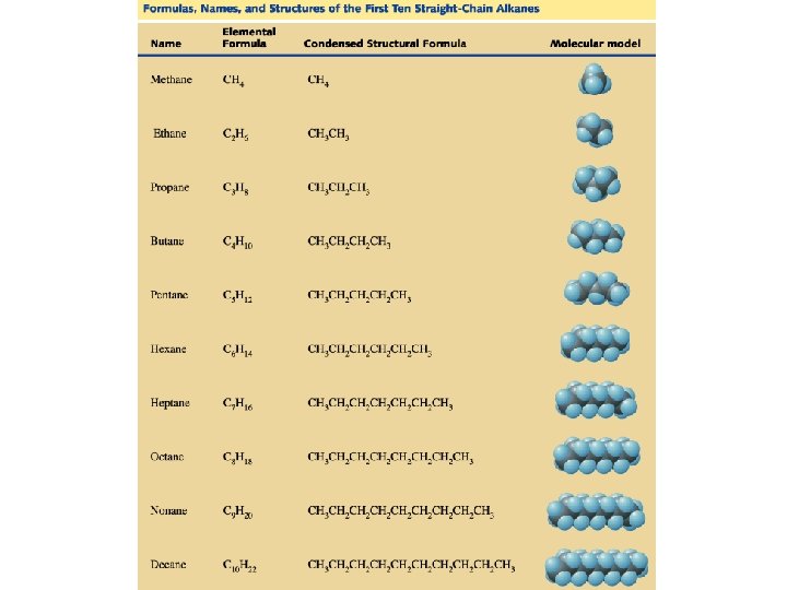 Alkanes • The structural formulas for the first four straight-chain (or normal) alkanes are shown below. methane propane butane