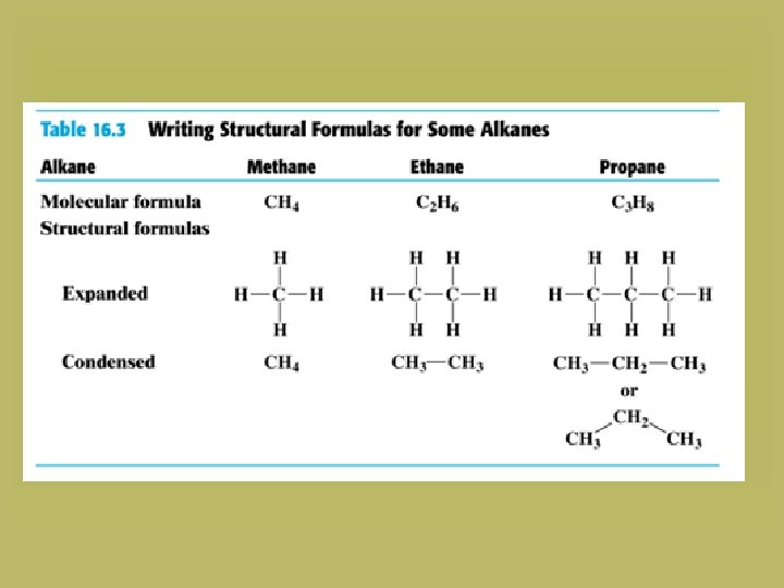 More Alkanes H H C C H H Condensed Structural Formulas H CH 3 Ethane H H H C C C H H CH 3 CH 2 CH 3 Propane