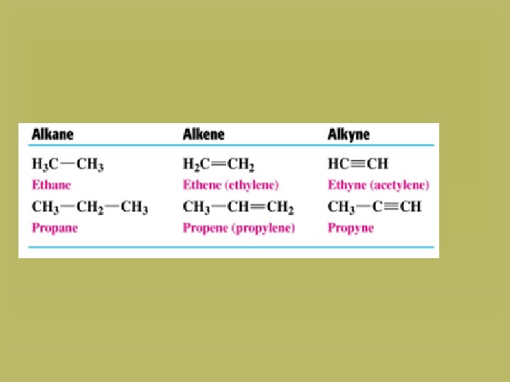 Alkynes • An unsaturated hydrocarbon that contains a carbon-carbon triple bond. • The molecular formula of this group is Cn. H 2 n-2 (n is number of carbon atoms). • They have less hydrogen atoms than alkanes and alkenes.