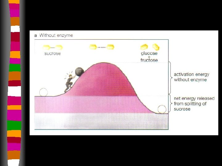 Activation Energy • The energy needed for a chemical reaction to occur • High when no enzyme is present • Low when an enzyme speeds up the reaction