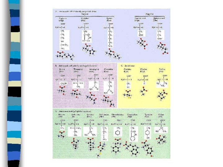 Proteins(examples of R-Groups) There are 20 different amino acids found in nature. Different proteins are determined by the type of amino acids connected together. All amino acids are the same except for the R-group. The R-group gives the amino acids different properties.