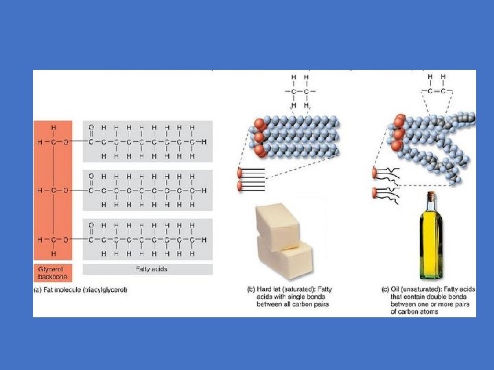 More About Lipids • Room temperature: fats-solid, oil-liquid • Insoluble (doesn’t mix with water) • Saturated fats: contain saturated fatty acids with single carbon bonds. Not good for you, solid. • Unsaturated fats: contain double carbon bond(s). Good for you, liquid. • Waxes • Phospholipids • Steroids: cholesterol