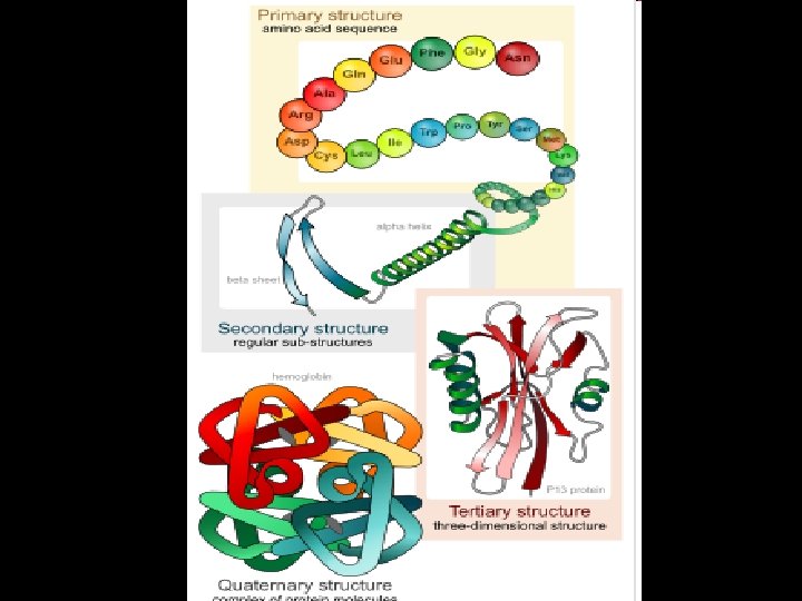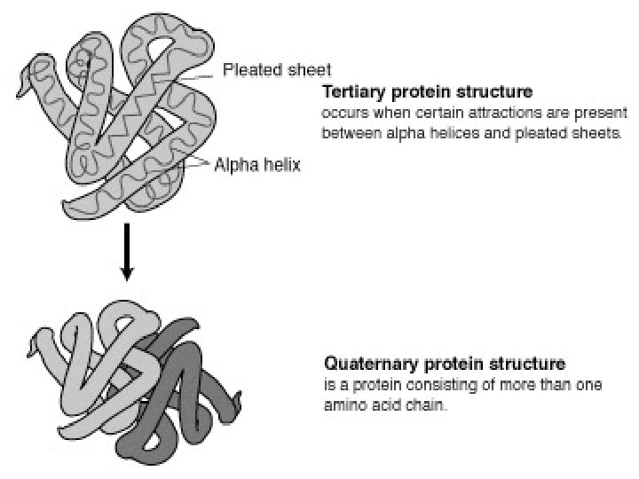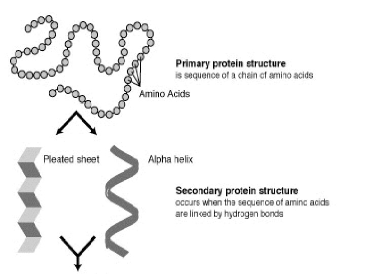 SECONDARY STRUCTURE (2 nd) • Next, the primary structure (the string of beads) begins to fold or coil up. • Different parts of the primary structure will coil (called alpha helices), and other parts will fold (called Betapleated sheets)