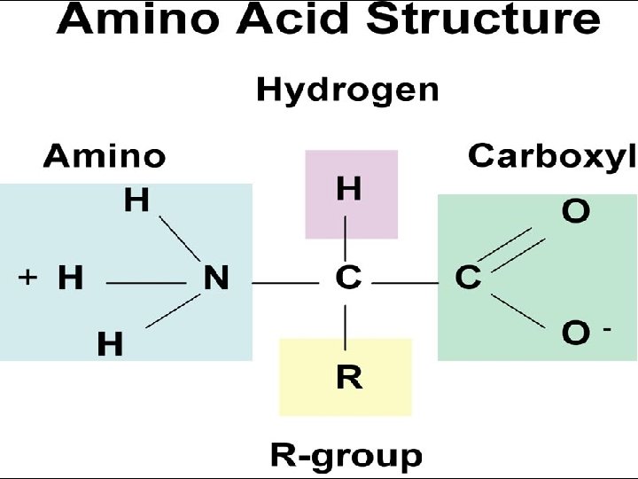 AMINO ACID STRUCTURE • Amino acids are made of: – Central carbon (one carbon in the middle) – 4 groups attached to the carbon • Amino group (NH 2 or NH 3+) • Carboxyl group (COOH or COO-) • Hydrogen group (H) • Random group (Also called a “side group” or “R-group”)