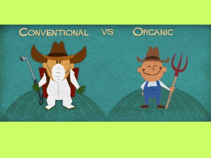 Effects of Conventional Farming: Ø Chemicals get into the food and affect our health Ø Excessive tillage causes soil erosion Ø Burning of fossil fuels causes global warming