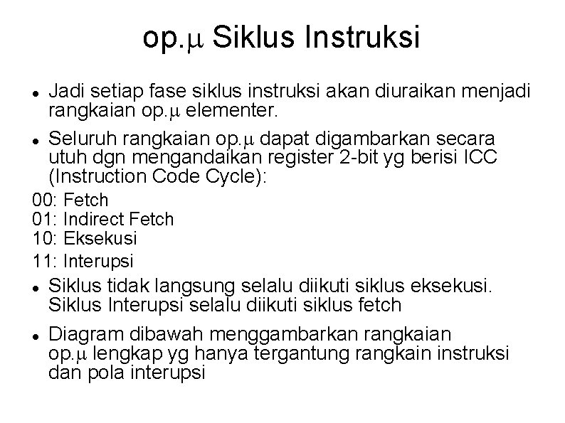 op. Siklus Instruksi Jadi setiap fase siklus instruksi akan diuraikan menjadi rangkaian op. elementer. Seluruh rangkaian op. dapat digambarkan secara utuh dgn mengandaikan register 2 -bit yg berisi ICC (Instruction Code Cycle): 00: Fetch 01: Indirect Fetch 10: Eksekusi 11: Interupsi Siklus tidak langsung selalu diikuti siklus eksekusi. Siklus Interupsi selalu diikuti siklus fetch Diagram dibawah menggambarkan rangkaian op. lengkap yg hanya tergantung rangkain instruksi dan pola interupsi