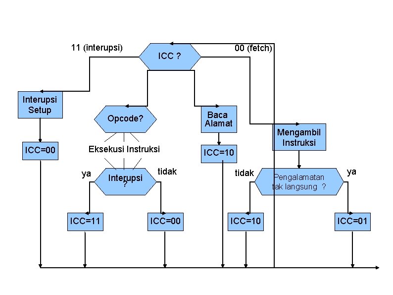 11 (interupsi) Interupsi Setup ICC=00 ICC ? Baca Alamat Opcode? Eksekusi Instruksi ya ICC=11 Interupsi ? 00 (fetch) Mengambil Instruksi ICC=10 tidak ICC=00 ICC=10 Pengalamatan tak langsung ? ya ICC=01