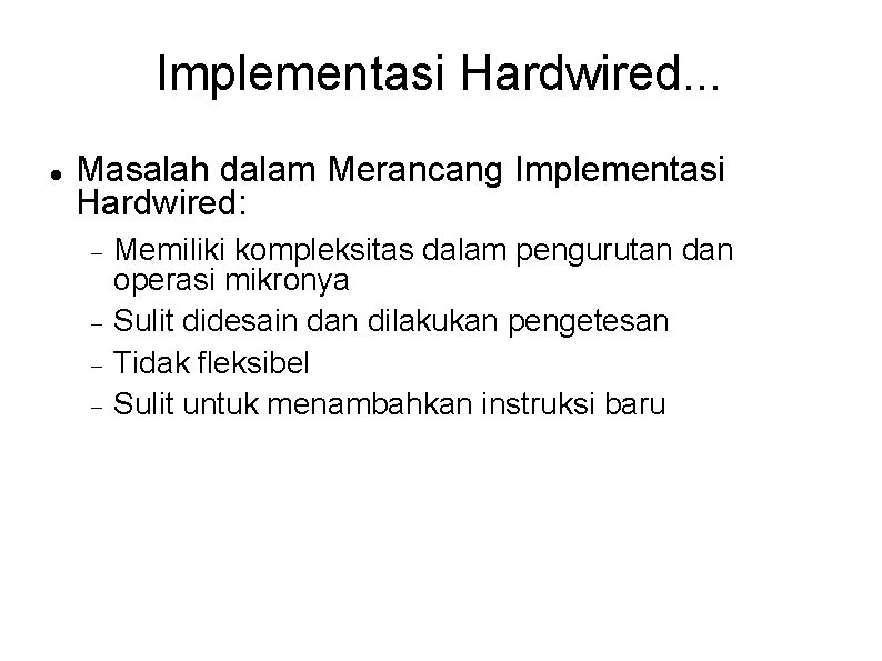 Implementasi Hardwired. . . Masalah dalam Merancang Implementasi Hardwired: Memiliki kompleksitas dalam pengurutan dan operasi mikronya Sulit didesain dan dilakukan pengetesan Tidak fleksibel Sulit untuk menambahkan instruksi baru