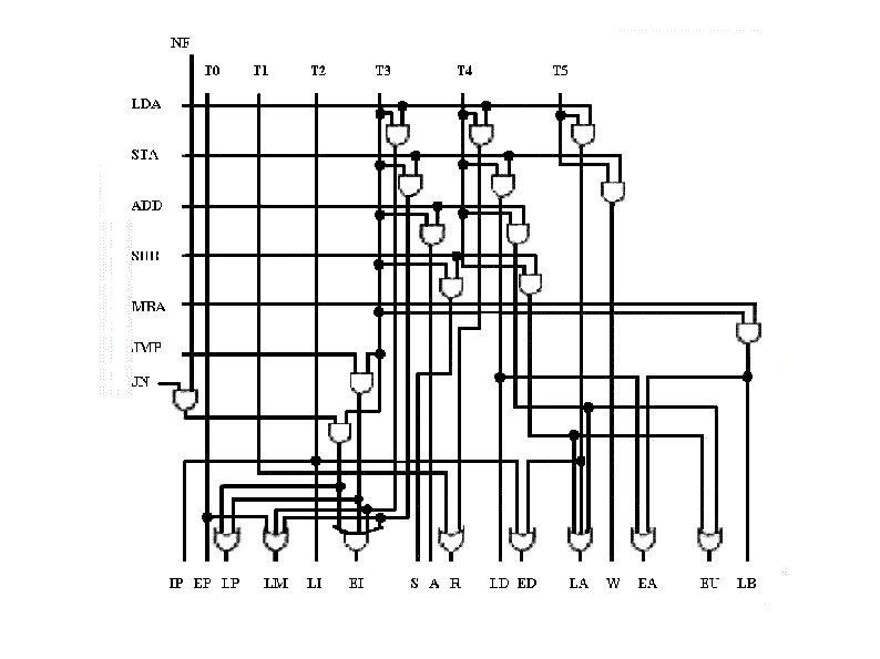 A Matrix of Times at which Each Control Signal Must Be Active in Order to Execute the Hard-wired Basic Computer's Instructions Control Signal: IP LP EP LM R W LD ED LI EI LA EA A S EU LB Instruction: --------------------------------------- "Fetch" T 2 T 0 T 1 T 2 LDA T 3 T 4 T 5 T 3 T 5 STA T 3 T 5 T 4 T 3 T 4 MBA T 3 ADD T 4 T 3 T 4 SUB T 4 T 3 T 4 JMP T 3 T 3 JN T 3*NF