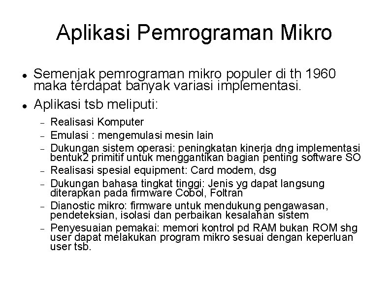 Aplikasi Pemrograman Mikro Semenjak pemrograman mikro populer di th 1960 maka terdapat banyak variasi implementasi. Aplikasi tsb meliputi: Realisasi Komputer Emulasi : mengemulasi mesin lain Dukungan sistem operasi: peningkatan kinerja dng implementasi bentuk 2 primitif untuk menggantikan bagian penting software SO Realisasi spesial equipment: Card modem, dsg Dukungan bahasa tingkat tinggi: Jenis yg dapat langsung diterapkan pada firmware Cobol, Foltran Dianostic mikro: firmware untuk mendukung pengawasan, pendeteksian, isolasi dan perbaikan kesalahan sistem Penyesuaian pemakai: memori kontrol pd RAM bukan ROM shg user dapat melakukan program mikro sesuai dengan keperluan user tsb.