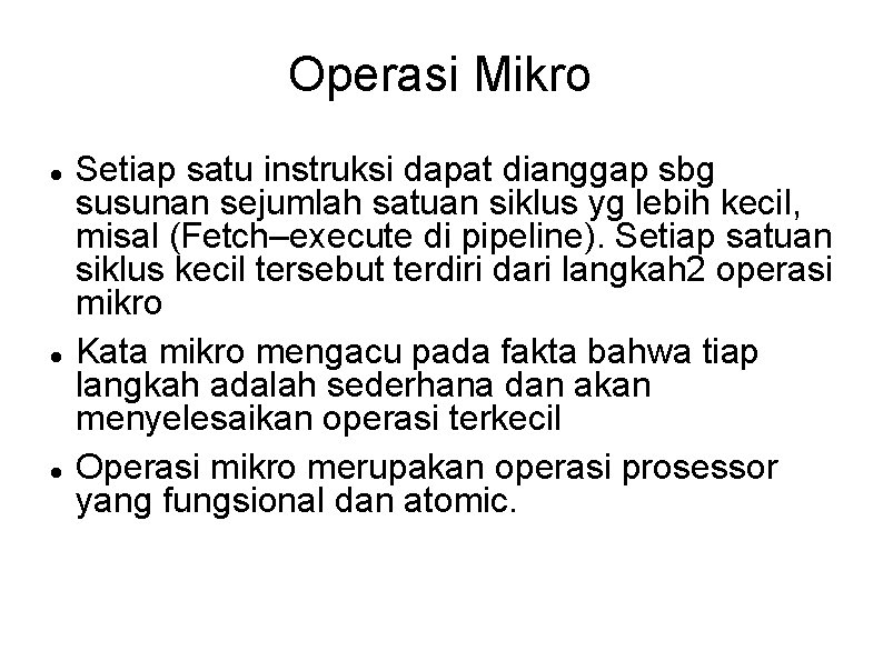 Operasi Mikro Setiap satu instruksi dapat dianggap sbg susunan sejumlah satuan siklus yg lebih kecil, misal (Fetch–execute di pipeline). Setiap satuan siklus kecil tersebut terdiri dari langkah 2 operasi mikro Kata mikro mengacu pada fakta bahwa tiap langkah adalah sederhana dan akan menyelesaikan operasi terkecil Operasi mikro merupakan operasi prosessor yang fungsional dan atomic.