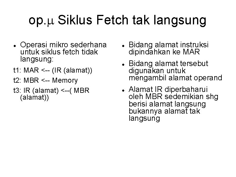 op. Siklus Fetch tak langsung Operasi mikro sederhana untuk siklus fetch tidak langsung: t 1: MAR <-- (IR (alamat)) t 2: MBR <-- Memory t 3: IR (alamat) <--( MBR (alamat)) Bidang alamat instruksi dipindahkan ke MAR Bidang alamat tersebut digunakan untuk mengambil alamat operand Alamat IR diperbaharui oleh MBR sedemikian shg berisi alamat langsung bukannya alamat tak langsung