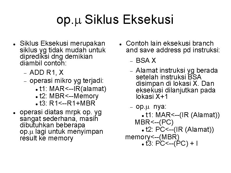op. Siklus Eksekusi merupakan siklus yg tidak mudah untuk diprediksi dng demikian diambil contoh: ADD R 1, X operasi mikro yg terjadi: t 1: MAR<--IR(alamat) t 2: MBR<--Memory t 3: R 1<--R 1+MBR operasi diatas mrpk op. yg sangat sederhana, masih dibutuhkan beberapa op. lagi untuk menyimpan result ke memory Contoh lain eksekusi branch and save address pd instruksi: BSA X Alamat instruksi yg berada setelah instruksi BSA disimpan di lokasi X. Dan eksekusi dilanjutkan pada lokasi X+1 op. nya: t 1: MAR<--(IR (Alamat)) MBR<--(PC) t 2: PC<--(IR (Alamat)) memory<--(MBR) t 3: PC<--(PC) + I