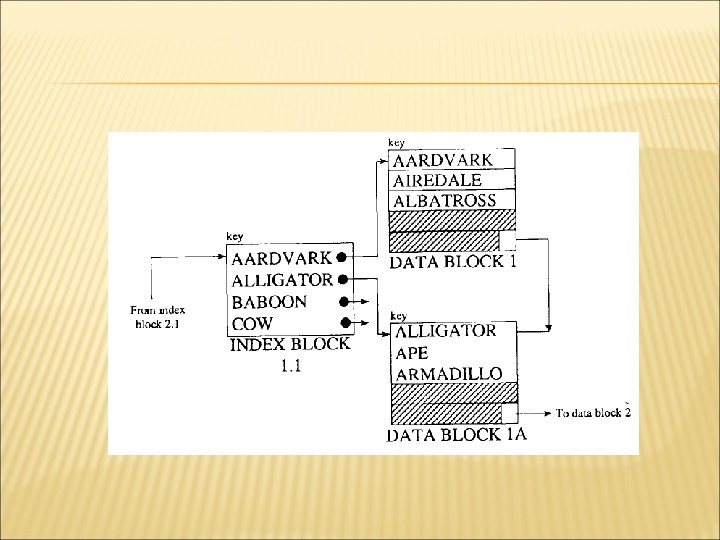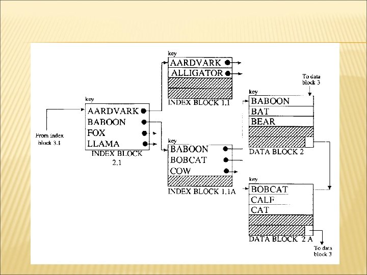 BLOK INDEKS DAN DATA � Pada pendekatan ini berkas indeks dan berkas data diorganisasikan dalam blok. Berkas indeks mempunyai struktur tree, sedangkan berkas data mempunyai struktur sekuensial dengan ruang bebas yang didistribusikan antar populasi record.