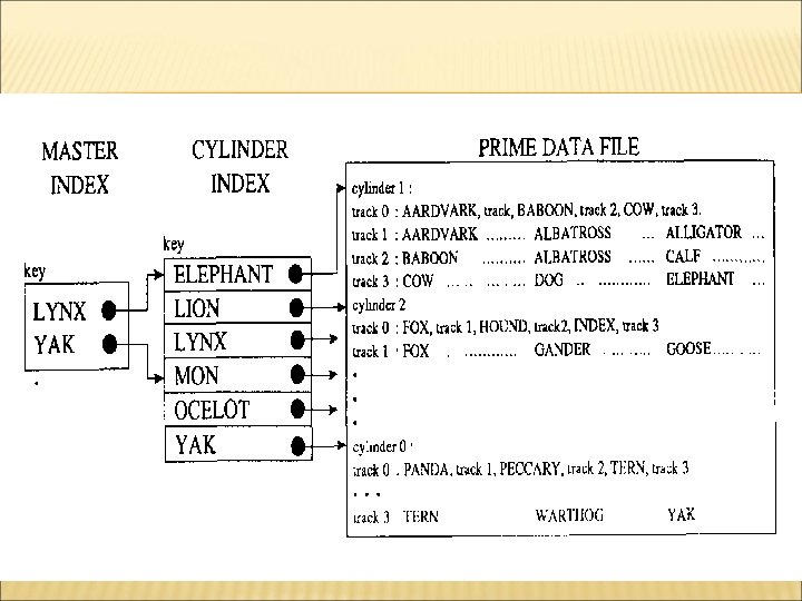 Misal setiap cylinder dari alat penyimpanan mempunyai 4 track. Pada berkas binatang ada 6 cylinder yang dialokasikan pada prime data area. Track pertama (nomor 0) dari setiap cylinder berisi sebuah indeks pada record key dalam cylinder tersebut. Entry pada indeks ini adalah dalam bentuk : nilai key terendah, nomor track Dalam sebuah track data, tracknya disimpan secara urut berdasarkan nilai key. Tingkat pertama dari indeks dalam berkas indeks dinamakan master index. Entry pada indeks ini adalah dalam bentuk : nilai key tertinggi, pointer Tingkat kedua dari indeks dinamakan cylinder index. Indeks ini berisi pointer pada berkas prime data dan entry-nya dalam bentuk : nilai key tertinggi, nomor cylinder