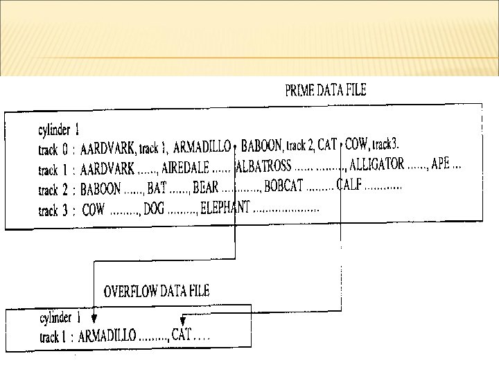 Karena ARMADILLO seharusnya berada setelah kelima entry pada track 1 dari cylinder 1, tetapi karena track ini sudah penuh, maka ARMADILLO dipindahkan ke overflow data area. Indeks track dari cylinder 1 harus dimodifikasi untuk memperlihatkan bahwa ada sebuah record pada overflow area yang secara logik seharusnya menempati pada akhir dari track 1, sehingga penambahan dari entry itu adalah : <ARMADILLO, ovfl-ptr> Dengan ovfl-ptr adalah : <cylinder, track, record>