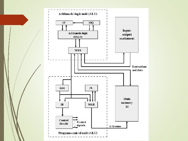 Komputer IAS • Memori Utama, untuk menyimpan data maupun instruksi. • Arithmetic Logic Unit (ALU), untuk mengolah data binner. • Control Unit, untuk melakukan interpretasi instruksi – instruksi di dalam memori sehingga adanya eksekusi instruksi tersebut. • I/O, untuk berinteraksi dengan lingkungan luar