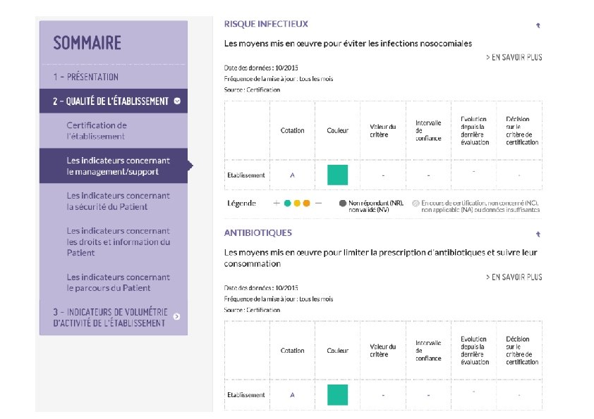 Tableau de bord IN - Bilan standardisé ü La publication en 2004 du premier indicateur ICALIN a marqué le début de cette démarche. Il comprend désormais plusieurs indicateurs avec un recueil en alternance d’indicateurs devenus très nombreux : ~15 indicateurs pour la qualité et la sécurité des soins dans les établissements de santé appelés « QALHAS » sous le pilotage de la HAS. ~7 indicateurs du tableau de bord des infections nosocomiales sous le pilotage du Ministère de la santé (DGOS) (HAS en 2016) ü Depuis 2009, un texte officiel fixe les conditions dans lesquelles l’établissement de santé met à la disposition du public les résultats, publiés chaque année, des indicateurs de qualité et de sécurité des soins ainsi que les dispositions applicables en cas de non-respect de cette obligation. ü Ces indicateurs sont obligatoires par arrêté et rendus publics. Site d’information Scope Santé