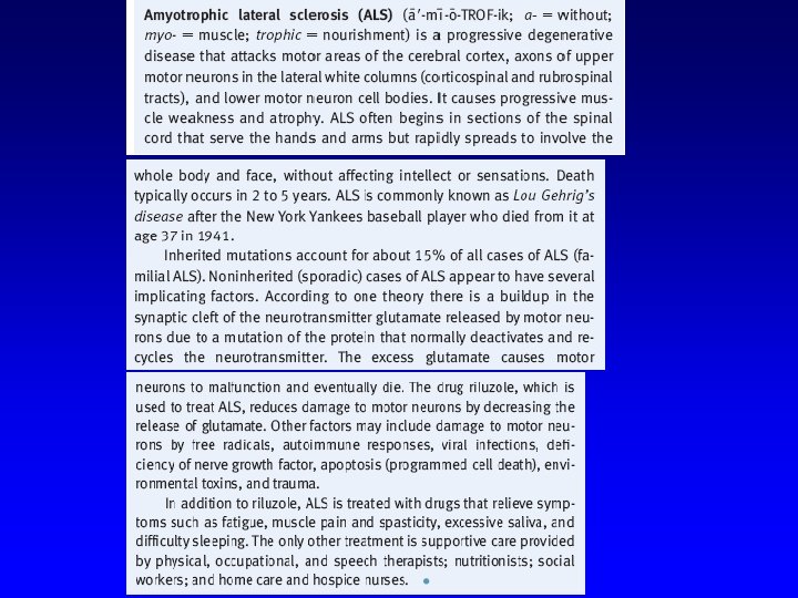 Huntington’s disease • Onset of symptoms usually at 30 to 45 years • Genetically determined (single dominant gene) • Causes degeneration of the output neurones from the striatum, reducing inhibitory modulation of motor function • Progressive disease causing involuntary muscle jerks • Dopamine Glutamate Striatum X GABA