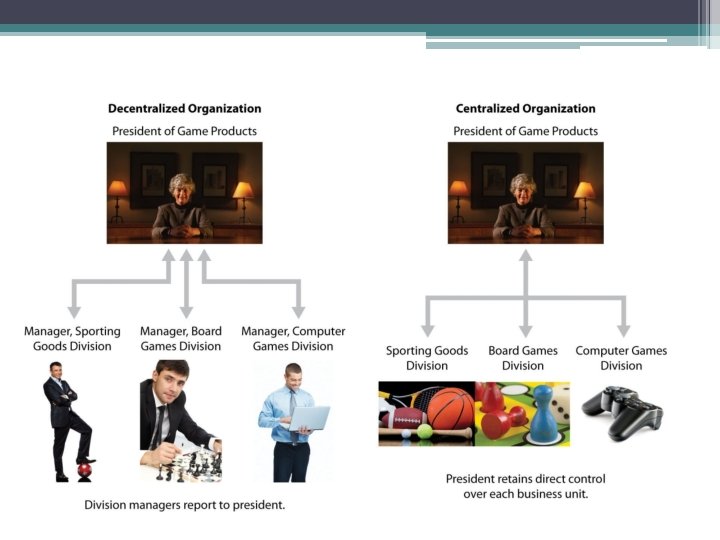 Differences between Centralization and Decentralization • • • Nature of Decisions Size of the organization Managerial requirement Operating expenses and cost Division of labour and specialization Control