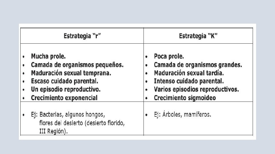 • ESTRATEGIAS DE VIDA: Son características de los organismos que dependen fundamentalmente de la estabilidad del ambiente. Se conocen dos tipos de estrategias: