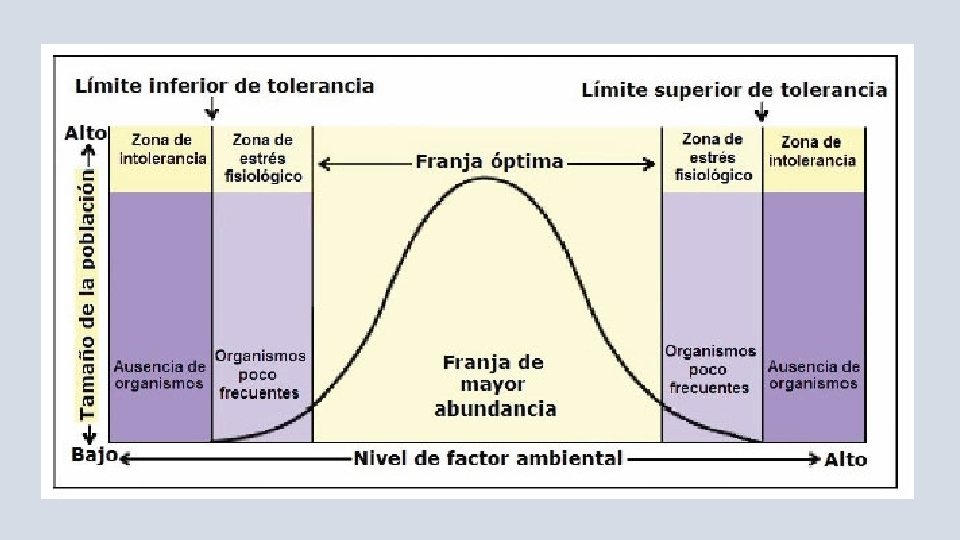 • FLUCTUACIÓN DEL TAMAÑO POBLACIONAL: • Existen varios factores que afectan el tamaño y la densidad de una población: luz, temperatura agua disponible etc. • La distribución de una especie puede trazarse en un gráfico. Estos gráficos muestran zonas de estrés y límites de tolerancia. • La zona óptima de tolerancia, corresponde a la parte central, tiene condiciones que favorecen el éxito reproductivo, el crecimiento, la abundancia y la supervivencia. • A cada lado de la zona óptima se encuentran las zonas de estrés, donde se hallan menos individuos y la supervivencia es menor. Los individuos son incapaces de reproducirse en zonas de estrés.