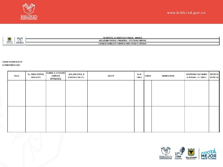 Definiciones Ítems – Formato Control de Comunicaciones Externas • • • Fecha: Diligenciar fecha de radicación del documento Numero Consecutivo de Radicación: Número que se asigna a la comunicación, para su respectivo tramite, seguimiento y control. Nombre de la Persona o Entidad Destinataria: Registrar los datos de la persona o entidad destinataria a quien va dirigida la comunicación o documento. Área, Persona o Biblioteca Remitente: Registrar los datos del área de nivel central o funcionario encargado que remite la comunicación o documento; así mismo en el caso de las Bibliotecas. Asunto: Diligenciar el asunto a tratar según el tipo de comunicación ( Interna o Externa) Folios: Diligenciar el numero de folios que conlleva cada comunicación. Anexos: Diligenciar si el documento contiene algún anexo ( CD, Fotos, planos, documentos, etc. ) Observaciones: Diligenciar alguna observación o comentarios sobre el documento radicado. Nombre del Funcionario responsable del tramite: Aplica únicamente cuando se reciban PQRS, ( Peticiones, Quejas, Reclamos, Solicitudes) diligenciar el nombre del funcionario, área o Biblioteca, a quien va dirigida. Tiempo de Respuesta: Diligenciar ´´SI´´ cuando se radiquen PQRS de acuerdo a los tiempos que otorga la Ley, e informar al Área de Contratación de Biblo. Red