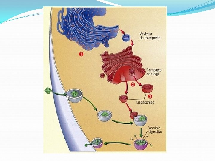 Funções das organelas citoplasmáticas Mitocôndrias Garante o fornecimento de energia para a célula Retículo endoplasmático rugoso Transporta substâncias dentro da célula e produz proteínas Retículo endoplasmático liso Transporta substâncias dentro da célula e produz lipídios (óleos ou gorduras). Ribossomos Produzem proteínas. Complexo de Golgi Empacota as substâncias produzidas pela célula em vesículas (pequenas bolsas). Secreção celular Centríolos Participam do processo de divisão celular Lisossomos Realizam a digestão intracelular Peroxissomos Neutralizam substâncias tóxicas produzidas pelas células (H 2 O 2) ou vindas de fora (álcool). Cloroplastos Realização da fotossíntese Vacúolos Reserva de água e sais minerais