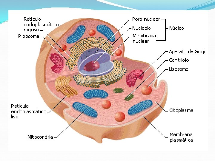 Célula procariótica Célula eucariótica animal Célula eucariótica vegetal Membrana plasmática X X X Parede celular X Citoplasma X X X X Retículo endoplasmático X X Mitocôndria X X Complexo Golgi X X Lisossomos X X Peroxissomos X X Centríolos X Núcleo DNA Ribossomos X X Vacúolo X Cloroplasto X