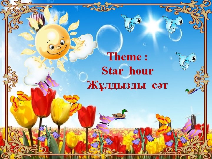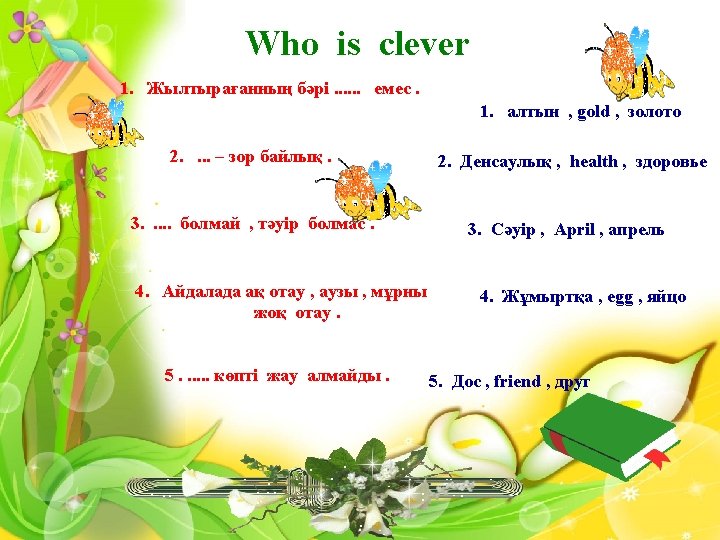 Riddles 1 little old women with twelve children Some short , some long , some cold , some hot 2. The teacher write on me with chalk , it is a black ; I cannot talk 3. It is white , it is cold. We can skate on it. What is it? 4. They don’t eat me along , But cannot eat without me. What am I ? ( year - год - жыл ) ( blackboard –доска –тақта ) (ice – лед – мұз ) ( salt –соль – тұз )