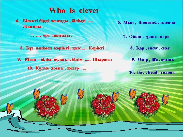 Our next stage is “ who is clever”. The task is : to find the answer and to translate it into Kazakh and Russia.