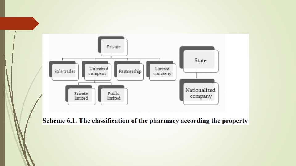 Pharmacy may be state and communal, private and with the collective pattern of ownership (according to the owner) as shown on scheme 2. On a form the management and to the sources of financing distinguish: self-supporting, which independently form profits as difference between the cost of sales and purchase cost of commodity; the state budget pharmacies belonging to the organizational clinic structure and is financed directly from the state budget. In obedience to territorial subordination city and rural pharmacies are determined. To directions of activity of pharmacy distribute on: retail, which carry out only the retail medicine sales, and hospital, interhospital, self-supporting, the state budget pharmacies, which serve hospital, nursery schools, sanatoriums and other organizations and enterprises, on the cashless form of calculation. Hospital and interhospital pharmacies are named abroad „hospital pharmacies”.