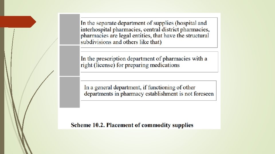 The commodity stocks include: • Products that are available in pharmacies and its structural subdivisions (pharmacy points); • Products that are purchased and left for responsible storage at suppliers; • Products that are were put for recycling (ex. medicinal herbs) Depending on the structure of pharmacy, the types of its activities (retail, wholesales, with the right to manufacture drugs, etc. ) commodity stocks can be concentrated in different places (scheme 10. 2).