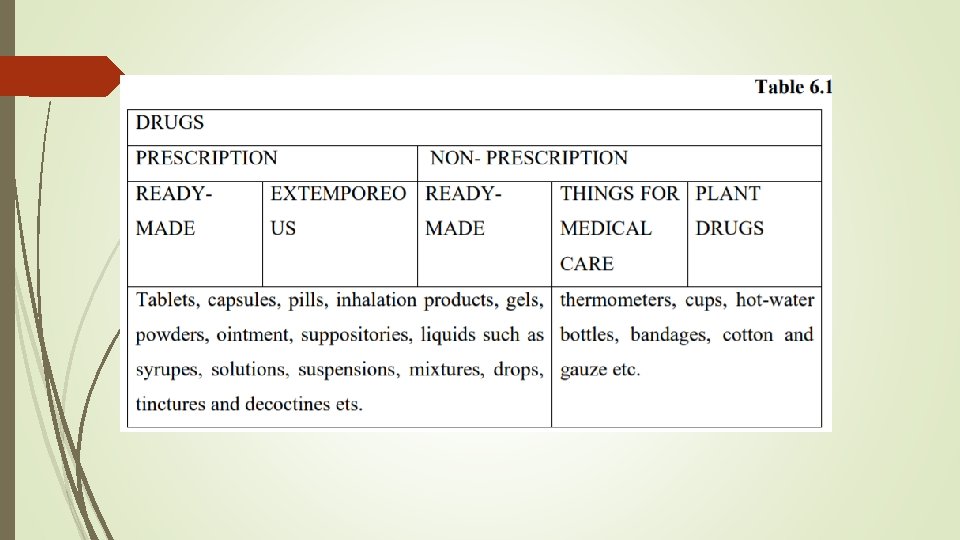 For example, they can be grouped according to their form, such as shown in the table 1. Or they can be classified according to the way they are taken such as by swallowing, inhaling, or injection. Drugs are also be grouped according to their chemical structure, to the major beneficial effect they have on body. One more classification that is certainly used at chemists devides them for two groups: prescription and nonprescription drugs (table 6. 1).