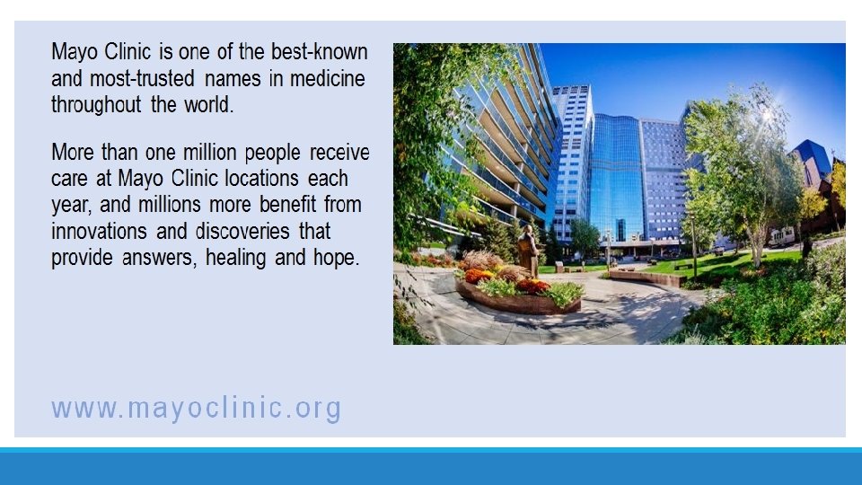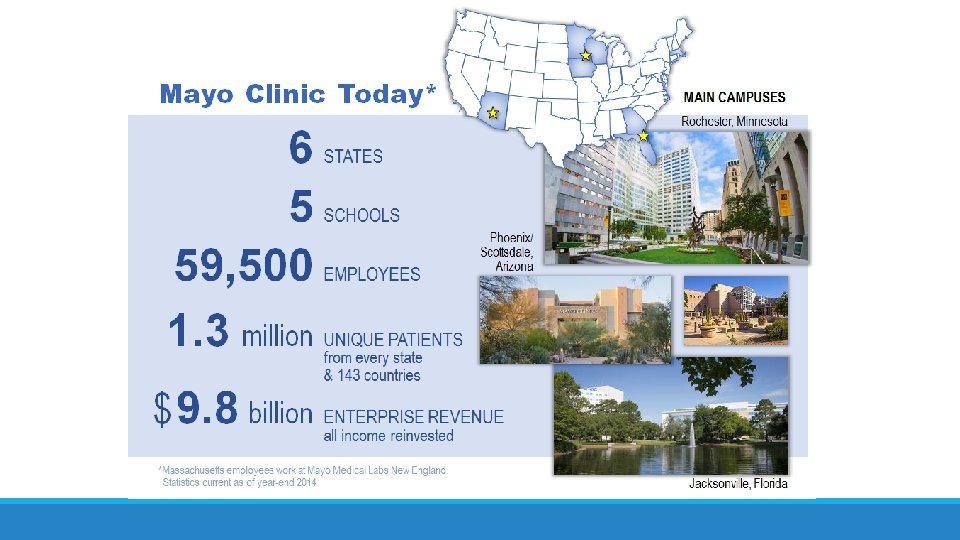 Locations (cont'd) FLORIDA Jacksonville campus: ◦ Ranked #1 in the state of Florida ◦ Ranked #1 in Jacksonville MAYO CLINIC HEALTH SYSTEMS Brings Mayo Clinic experience to those further away. ◦ 60 locations throughout the U. S. ◦ 1, 000 providers ◦ "We are Here for You. For Life"