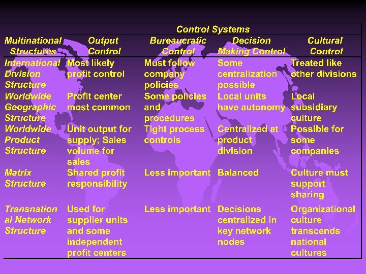 Exhibit 8. 11 shows the relationship between the control mechanisms and basic multinational organizational structures.