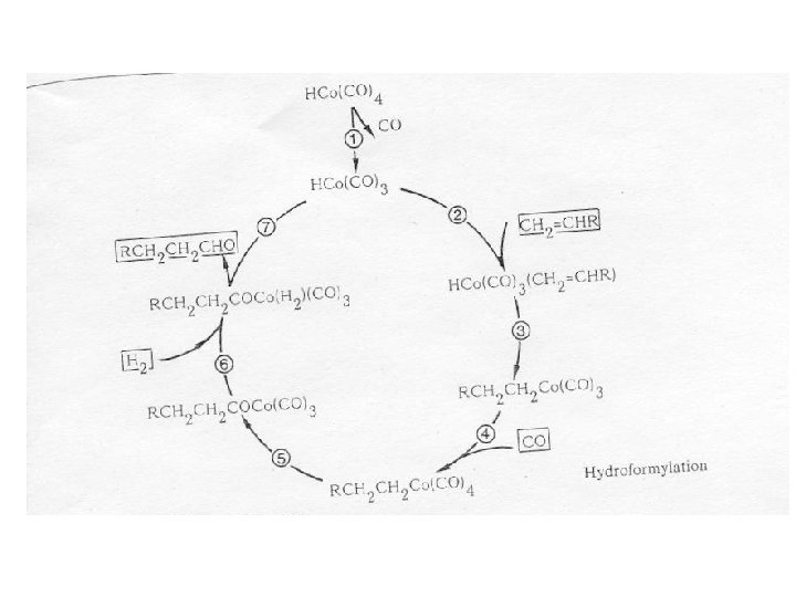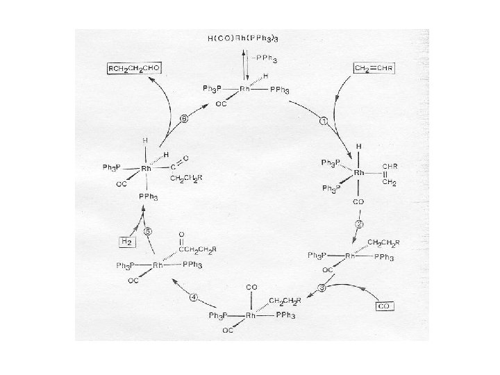 Organometallic Catalysts (hydroformylation) • Converting terminal alkenes into other organic products. – (oxo process) H and HCO are formally added across a double bond. • Show reaction • Largest-scale industrial process that is homogeneous • Mechanism was suggested by Heck and Breslow in 1961. – Examine each step in the cycle and characterize the reaction according to type. • 18 -, 16 -electron cycling is common.