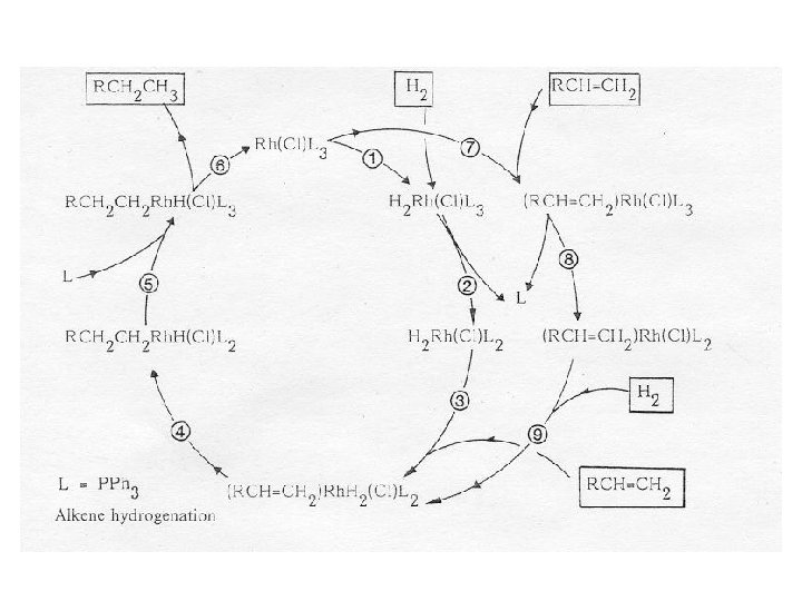 Hydrogenation of Alkenes • Wilkinson’s catalyst – Show reaction (alkenes and alkynes) • Show mechanism and discuss – Step 9 is slow, the sequence 1 2 3 is favored. – The rate determining step is insertion, 4. • The catalyst hydrogenizes terminal and internal olefins. • Examine Table 14 -3.