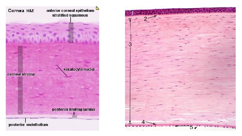 1. EPITHELIUM ANTERIOR (EPITELIUM STRATIFICATUM SQUAMOSUM) 2. LAMINA LIMITANS ANTERIOR 3. SUBSTANSIA PROPRIA 4. LAMINA LIMITANS POSTERIOR 5. EPITHELIUM POSTERIOR (EPITHELIUM SIMPLEX CUBOIDEUM)